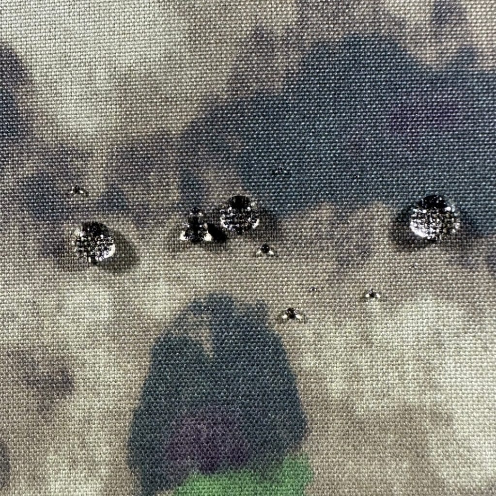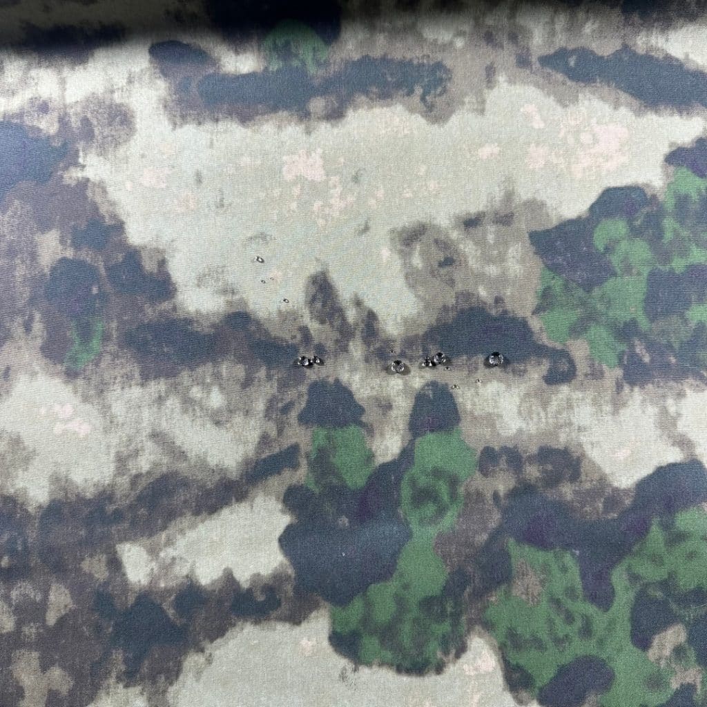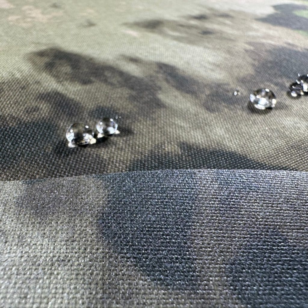 330D Nylon Cordura-style Fabric A-TACS FG IRR camouflage + PU coating. Reference waterproof test shows 3000 mmH₂O for the sampled construction. Actual performance depends on PU coating level, fabric build, and test method. If you have a target rating (e.g., 3000 / 5000 / 8000 / 10000 / 20000 mm), tell us your end use and we’ll recommend the best coating spec.